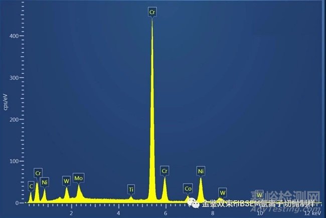 通過結(jié)合EBSD和EDS鑒定裂紋尖端的粒子為M23C6結(jié)構(gòu)的鉻鉬碳化物。這是利用 相鑒別工具得到的。