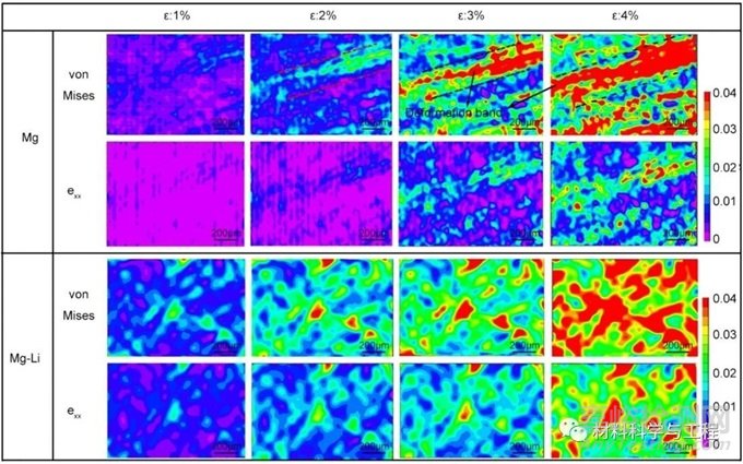 圖1 室溫下,純Mg與Mg-4.5Li板材沿TD方向拉伸過(guò)程中的應(yīng)變分布圖。