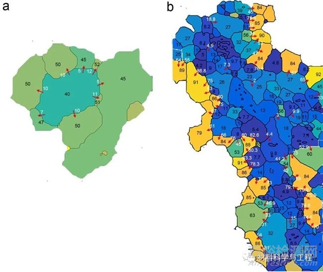 圖3 圖2中(a) Mg-4.5 wt. % Li和(b)純Mg的典型區(qū)域的AS和ΔAS的定量分析。黑色和白色數(shù)字分別代表晶粒的AS和相鄰晶粒間的ΔAS。