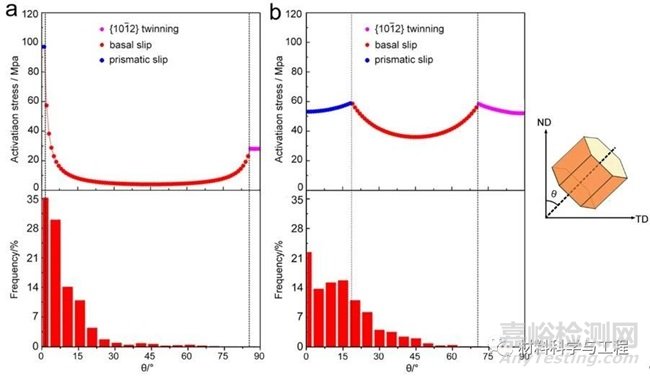圖4 (a)純Mg和(b) Mg-4.5 wt. % Li中不同取向晶粒的啟動(dòng)應(yīng)力值及晶粒取向分布。