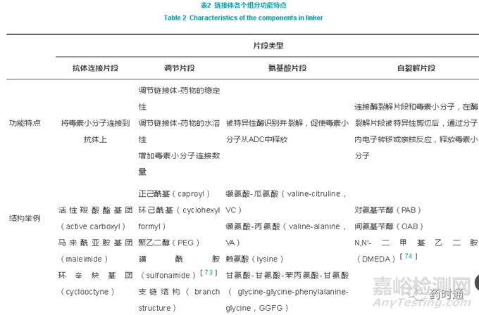 鏈接體一般包括4個分子片段:抗體連接片段、調節(jié)片段、酶降解片段和自裂解片段(表2)。開發(fā)者通常依據(jù)毒素小分子的特性以及與抗體連接的方式,并結合對ADC分子的影響,開展綜合分析評估來篩選上述4個片段,最終確定鏈接體的結構。