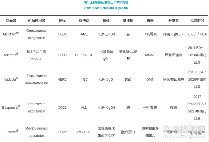 魔法子彈這一概念是由諾貝爾獎獲得者德國科學家Paul Ehrlich在20世紀初提出的,特指一類能靶向結合目標病灶進而治愈疾病的一類分子。而將這一概念實物化為抗體加上毒素小分子這一藥物分子形式的時間則是在1957年,Mathé等將化療藥物甲氨蝶呤通過重氮偶合反應偶聯(lián)至抗L1210白血病細胞的免疫球蛋白上,該偶聯(lián)物展現(xiàn)了針對靶細胞L1210的細胞增殖抑制作用,而偶聯(lián)至常規(guī)β球蛋白的偶聯(lián)物則無作用。又經過十多年的發(fā)展,在1970年代中期,有多個利用動物源免疫球蛋白制備的ADC在臨床試驗中展現(xiàn)出了確定的療效。到1980年代,單克隆抗體開發(fā)技術和重組蛋白生產技術的進步、多種腫瘤標志物的確證,以及對靶點抗原-抗體介導的細胞內吞機制的闡明,同時在靶點、抗體以及鏈接體等多個方面給ADC藥物的技術發(fā)展帶來了巨大推動力,進而在1990年代吸引了藥物研發(fā)和生物科技公司加大投入ADC藥物的開發(fā),并于2000年迎來第一個ADC藥物Mylotarg®的獲批上市。Mylotarg®是CD33靶向的ADC用于治療急性髓系白血?。╝cute myeloid leukemia,AML)。又過去了十多年后,用于治療霍奇金淋巴瘤(Hodgkin lymphoma,HL)和間變性大細胞淋巴瘤(anaplastic large cell lymphoma,ALCL)的CD30靶向的Adcetris®在2011年獲批上市,用于治療晚期轉移性乳腺癌的HER2靶向的Kadcyla®于2013年獲批上市。這兩款ADC藥物在晚期腫瘤患者中的顯著療效和良好的安全性,使得ADC藥物正式作為一類新型的治療手段得到腫瘤患者、腫瘤醫(yī)療界和生物制藥工業(yè)界的廣泛認可,迅速成為了全球生物醫(yī)藥學術界以及工業(yè)界的熱點領域之一,更值得一提的是日本第一三共公司開發(fā)的HER2靶向的ADC藥物Enhertu®在2019年首次獲批上市,其具有劃時代的意義,不僅針對HER2高表達的腫瘤有顯著療效,而且在HER2低表達晚期乳腺癌患者中也表現(xiàn)了明顯療效。截至2023年3月全球已有14款ADC藥物獲批上市(表1),其中9款是在近4年內獲批的,2022年ADC藥物全球銷售額達到67.8億美元,處于臨床研究階段的ADC藥物分子則超過140個,而且呈現(xiàn)逐年快速增長的趨勢有望給腫瘤患者帶來更有效的治療藥物。