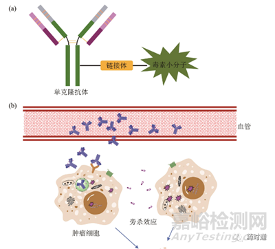 經典的ADC藥物由單克隆抗體、鏈接體和毒素小分子3部分組成(圖1a)。每個組成部分發(fā)揮著不同的功能:抗體部分負責將ADC分子選擇性地遞送至腫瘤細胞表面,同時通過靶點介導的內吞作用進入到細胞內;鏈接體則負責在腫瘤細胞內或者表面高效釋放毒素小分子,而在血液循環(huán)系統(tǒng)中保持穩(wěn)定;毒素小分子則負責高效地殺傷腫瘤細胞,有些小分子還同時具備細胞穿膜滲透性,可以通過擴散效應作用于靶細胞周圍的腫瘤細胞,起到“旁殺效應(bystander effect)”(圖1b)。因此,ADC藥物每個組成部分的特性都對其發(fā)揮靶向治療作用至關重要,同時各個組分的選擇也都可能會影響到ADC的安全性和有效性。