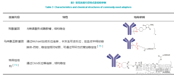 鏈接體的穩(wěn)定性決定了ADC藥物中的毒素小分子是傳遞到腫瘤細胞內部還是有可能在運輸過程中過早釋放并跟隨血漿傳遞到所有組織,顯著影響ADC藥物的安全性和有效性。ADC藥物的穩(wěn)定性一般受抗體與鏈接體的偶聯(lián)方式、調節(jié)片段和氨基酸片段3個方面的影響,其中,偶聯(lián)方式由抗體連接片段決定,常見連接片段的特點及結構舉例見表3。