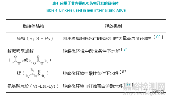 與常規(guī)ADC相比,非內吞ADC對鏈接體的要求有著顯著的區(qū)別(表4),需要能夠在腫瘤微環(huán)境中通過不同的方式有效釋放載荷分子,而不是在細胞內的溶酶體中。