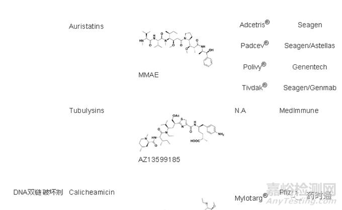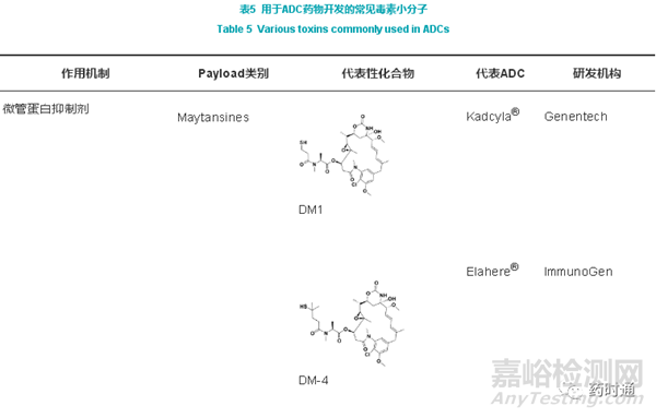 微管蛋白作為細胞骨架的主要構成物質,除能夠支撐細胞結構完整性外,同時還在細胞增殖的有絲分裂階段具有至關重要的作用。通過抑制微管蛋白的生成和聚集(polymerization),既能夠殺傷腫瘤細胞,也可以抑制腫瘤細胞的快速增殖。常用于ADC構建的微管蛋白抑制劑包括美登素(Maytansines)、海兔毒素(Auristatins)和Tubulysins等。