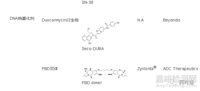 該類化合物細胞殺傷活性在皮摩爾級別,比微管蛋白抑制劑活性更強,因此,能夠大幅降低ADC的給藥劑量,但治療窗也會相應縮小。常用的DNA烷基化試劑為PBD(pyrrolobenzodiazepine)二聚體和Duocarmycin兩類化合物,目前已進入商業(yè)化的ADC中僅有一款使用PBD二聚體作為毒素小分子——CD19靶向的Zynlonta®。