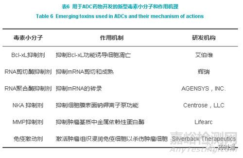 除上述主要已應用于商業(yè)化ADC藥物的毒素小分子外,其他各類作用機制的毒素也被逐步應用于ADC藥物開發(fā)中,如Bcl-xL抑制劑、RNA剪切酶抑制劑、RNA聚合酶抑制劑等。另一類新穎毒素小分子則作用于細胞膜表面靶標或者腫瘤組織基質靶標,用于非內吞型ADC藥物的開發(fā),如NKA(Na+/K+-ATPase,鈉鉀離子泵ATP酶)抑制劑、基質金屬依賴性蛋白酶(matrix metalloproteinases,MMP)抑制劑和免疫激動劑等,其各自的作用機制如表6所示。