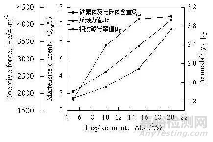 由圖2可知,隨著奧氏體不銹鋼件形變量ΔL/L增大,材料微觀組織中奧氏體相逐漸轉(zhuǎn)變?yōu)殍F素體及馬氏體,形變量ΔL/L達(dá)到20%時(shí),馬氏體含量值CFM已經(jīng)超過10%,宏觀物理表現(xiàn)為材料的磁導(dǎo)率和矯頑力增大,即相對磁導(dǎo)率值μr從1.030增大到最大值2.735(此時(shí)伸長率為20%),矯頑力Hc最大值為4238A/m,當(dāng)形變量超過20%后,矯頑力變化很小,表明材料拉伸后表現(xiàn)出的鐵磁特性趨近于飽和。