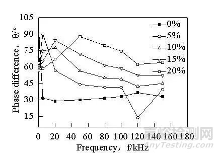 隨試件形變量的增加,頻率越低,θ值增大,表明當(dāng)奧氏體不銹鋼在制造或在役中,由于試件產(chǎn)生微量形變后,產(chǎn)生了馬氏體相變,改變了試件本身的磁導(dǎo)率值,使其具有鐵磁材料的一些磁特性,進(jìn)而導(dǎo)致渦流檢測最佳檢測頻率發(fā)生了變化,當(dāng)頻率低于100kHz時(shí),電導(dǎo)率信號和提離信號有較大的相位差,而且這種相位差使得缺陷檢出效果要優(yōu)于試件磁導(dǎo)率μr=1時(shí)渦流檢測效果,例如在激勵(lì)頻率為50kHz時(shí),形變量0%、5%、10%、15%和20%對應(yīng)的θ值分別為30°、44°、59°、74°和89°。