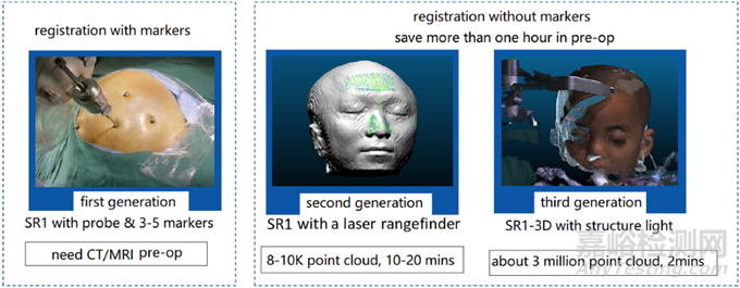 有關(guān)注冊技術(shù)介紹,神經(jīng)外科醫(yī)生通過注冊技術(shù)可將實際位置與影像模型進(jìn)行配準(zhǔn)定位,這是機器人神經(jīng)外科的核心步驟。到目前為止,在該領(lǐng)域已經(jīng)使用了三代配準(zhǔn)方法,如圖所示。第一代,自2005年起,標(biāo)記注冊;第二代,2009年以來,激光點云注冊;第三代,2019年開始,3D結(jié)構(gòu)光配準(zhǔn)。后面的文章中使用示例來展示這些技術(shù)細(xì)節(jié)。