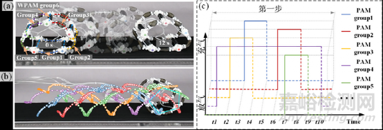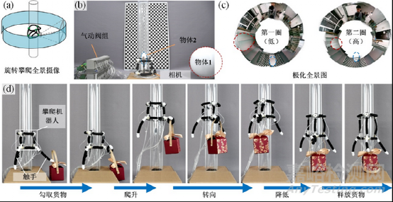 攀爬是移動(dòng)機(jī)器人的另一種不同尋常的運(yùn)動(dòng)能力,它們可以在各種3D表面上移動(dòng)來(lái)執(zhí)行給定的任務(wù)。TriUnit還可以用于管外和管內(nèi)爬升 (其步態(tài)如圖所示)。不過(guò)具有三根軸向CPAM的TriUnit 比具有三根軸向WPAM的TriUnit 爬升得慢得多。基于CPAM和WPAM的攀爬機(jī)器人的運(yùn)動(dòng)基于釋放、收縮/伸展和擁抱的動(dòng)作,其靈感來(lái)自猴子的手臂或腿部夾緊和釋放動(dòng)作,分別如圖5所示。圖5c所示驅(qū)動(dòng)序列同樣適用于WPAM攀爬機(jī)器人的向下攀爬,圖5d所示驅(qū)動(dòng)序列同樣適用于CPAM攀爬機(jī)器人的向下攀爬。