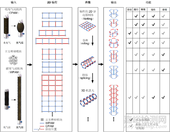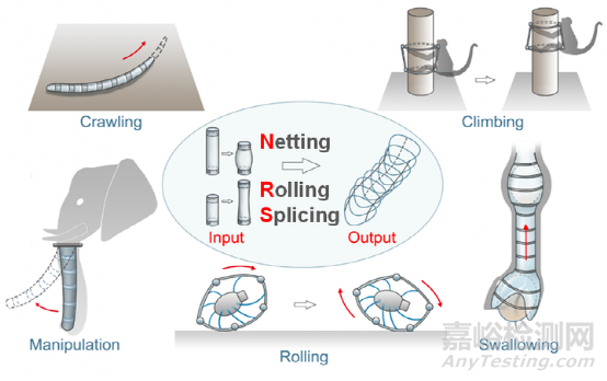 在未知和不可預(yù)測(cè)的環(huán)境中,越來(lái)越需要具有多種功能的軟體機(jī)器人來(lái)實(shí)現(xiàn)安全、自適應(yīng)和自主功能。機(jī)器人堆垛是一種很有前途的解決方案,它可以增加軟體機(jī)器人的功能多樣性,以實(shí)現(xiàn)安全的人機(jī)交互和適應(yīng)非結(jié)構(gòu)化環(huán)境。然而,現(xiàn)有的大多數(shù)多功能軟機(jī)器人功能有限,或者沒(méi)有充分顯示出機(jī)器人堆垛方法的優(yōu)越性。在此,我們提出了一種新穎的機(jī)器人堆疊策略——網(wǎng)狀卷曲拼接(Netting-Rolling-Splicing, NRS),一種基于網(wǎng)狀堆疊式氣動(dòng)人工肌肉的2d 結(jié)構(gòu)經(jīng)過(guò)卷曲-拼接提升3D維度的方法,從而基于相同的、簡(jiǎn)單的、低成本的模塊快速高效地制造多功能軟體機(jī)器人。