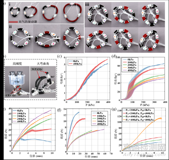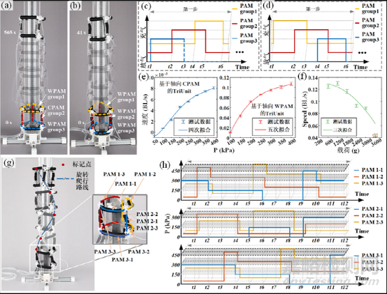 此外,通過(guò)改變控制策略,可以實(shí)現(xiàn)更多的運(yùn)動(dòng)方式。如圖5g所示,具有軸向WPAMs的TriUnit在攀爬管柱時(shí),還能以1.6°/s的速度實(shí)現(xiàn)順時(shí)針和逆時(shí)針旋轉(zhuǎn)。它的旋轉(zhuǎn)運(yùn)動(dòng)依賴于所有9個(gè)驅(qū)動(dòng)器的獨(dú)立控制和它們的不對(duì)稱運(yùn)動(dòng),這是受到猴子在橫向樹(shù)狀運(yùn)動(dòng)時(shí)肢體和脊柱的協(xié)作運(yùn)動(dòng)啟發(fā) (圖5h)。