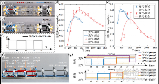 爬行是移動(dòng)機(jī)器人的基本運(yùn)動(dòng)功能之一。受蠕蟲(chóng)的啟發(fā),TriUnit也可以用于簡(jiǎn)單的單向爬行。由于WPAMs可以實(shí)現(xiàn)更大的膨脹行程,具有三根軸向WPAMs的TriUnit爬行器 (配備單向車輪) 比具有三根軸向CPAMs的TriUnit爬行得更快。CPAM和WPAM履帶式機(jī)器人的控制策略靈感來(lái)自于毛毛蟲(chóng)的身體爬行和腳定位,如圖所示,其中單節(jié)TriUnit僅使用軸向驅(qū)動(dòng)器進(jìn)行爬行。而以蚯蚓為靈感的波動(dòng)爬行運(yùn)動(dòng)也可以通過(guò)堆疊多個(gè)TriUnits來(lái)實(shí)現(xiàn),不需要單向輪等單向結(jié)構(gòu),如圖4。