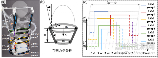 在這項(xiàng)工作中,基于TriUnits的吞咽機(jī)器人能夠用于包覆抓取和內(nèi)穿運(yùn)輸。本研究中的機(jī)器人吞咽機(jī)器人不僅可以實(shí)現(xiàn)吞咽和儲(chǔ)存,還可以實(shí)現(xiàn)類動(dòng)物的反芻和內(nèi)部物質(zhì)運(yùn)輸。為了更好的可視化,我們將三個(gè)TriUnit堆疊在一起,形成一個(gè)垂直的機(jī)器人吞咽器,其中兩個(gè)TriUnit,一個(gè)基于WPAMs和CPAMs,另一個(gè)TriUnit則完全基于WPAMs。如圖6a為一個(gè)直徑120毫米、重89克的3D打印球被機(jī)器人吞下。吞咽運(yùn)動(dòng)受蛇吞咽的啟發(fā),是通過(guò)截面和軸向PAM的不斷擠壓和推動(dòng)來(lái)實(shí)現(xiàn)的,由1-6組氣動(dòng)肌肉的連續(xù)膨脹和收縮來(lái)實(shí)現(xiàn)的,如圖6所示。