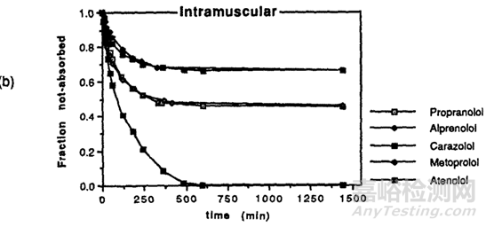 圖3 不同β受體阻斷劑肌肉注射后藥物剩余量