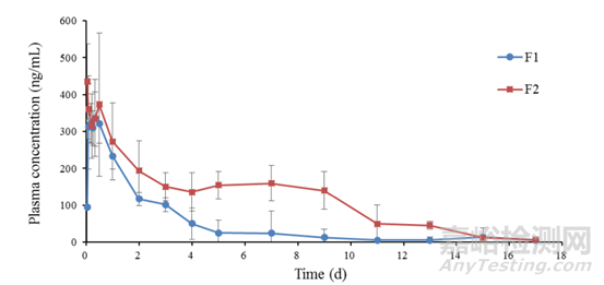 圖4 經(jīng)肌肉注射給予大鼠125 mg/kg美金剛雙羥萘酸鹽混懸劑(F1(晶型I)和 F(晶型II))的血藥濃度-時(shí)間曲線(mean±SD;n = 6)
