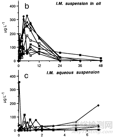 通過文獻(xiàn)[17]發(fā)現(xiàn),將青蒿素制備成油混懸劑和水混懸劑,分別肌肉注射給10名志愿者,結(jié)果驚奇地發(fā)現(xiàn),青蒿素的油混懸劑在體內(nèi)的吸收明顯快于水混懸劑,結(jié)果見下圖7,其中b為青蒿素油混懸劑,c為青蒿素水混懸劑:通常情況油混懸或水混懸被認(rèn)為是一種緩釋體系,而且油在體內(nèi)吸收是相當(dāng)慢的,有時(shí)候油在體內(nèi)可長(zhǎng)達(dá)一個(gè)月,而本文獻(xiàn)中藥物形成的油混懸劑的吸收快于水混懸劑,主要可能是青蒿素快速溶于油中,然后再?gòu)挠椭蟹峙涞浇M織液中,而青蒿素在水中不溶,因此,沒有油起媒介的作用,最終導(dǎo)致青蒿素水混懸劑慢于油混懸劑。通過查找文獻(xiàn)[18]得知青蒿素在水中的溶解度小于在油中的溶解度,青蒿素在水中和不同pH條件下溶解度為60ug/ml~82ug/ml,而青蒿素在不同油中的溶解性為1.4mg/ml~10mg/ml,在pH7.4的油水分配系數(shù)為1.58。