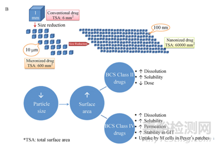 圖2 Comparison of micro-sized and nano-sized drug crystal in size and distribution in droplets [2]; (B) Advantageous absorption behavior of drug nanocrystals beyond micronized drug