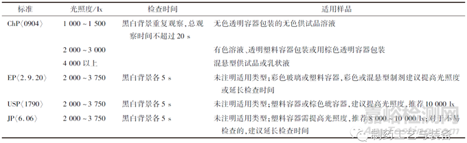 表1 各國(guó)藥典注射劑中可見異物燈檢法比較