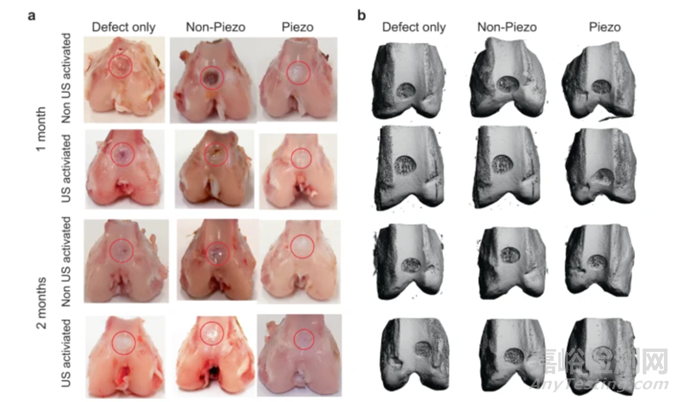 圖2:a) 數(shù)碼照片顯示僅有缺陷的兔股骨、非壓電組和壓電水凝膠組(有或沒有 US 激活)(1-2 個月)。紅色圓圈標記了缺陷最初產(chǎn)生的位置。b) 使用 µ-CT 重建股骨上的骨骼。