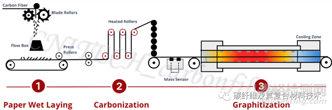 碳基氣體擴(kuò)散層(即:“碳纖維紙”)的典型制造過(guò)程包括三個(gè)主要步驟:濕鋪、碳化和石墨化。