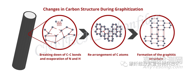 碳纖維是無(wú)定形材料,這也就意味著,它們的原子排列不呈現(xiàn)長(zhǎng)程有序。簡(jiǎn)單地說(shuō),碳纖維最初是由隨機(jī)取向的碳原子組成的。在熱處理的初始階段,碳-碳鍵被分解,氫、氮等揮發(fā)性成分蒸發(fā),留下富含碳的結(jié)構(gòu)。最終,在如此高的溫度下長(zhǎng)時(shí)間加熱會(huì)給碳原子足夠的能量,讓它們重新排列自己,實(shí)現(xiàn)更有序的結(jié)構(gòu)。