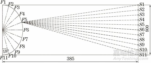 使用傳統(tǒng)彈性波法檢測(cè)混凝土內(nèi)部缺陷時(shí),最常見的檢測(cè)剖面為雙面平行的矩形剖面和僅有一組對(duì)面平行的梯形剖面,由于在工程混凝土的檢測(cè)中彎曲界面較少,且混凝土缺陷檢測(cè)的相關(guān)規(guī)范中有關(guān)于平行檢測(cè)面的強(qiáng)制要求,故目前對(duì)彎曲界面檢測(cè)的研究不多。為了滿足工程實(shí)際需要,這里以彎曲界面為模型進(jìn)行檢測(cè)研究。單彎曲界面檢測(cè)剖面模型如圖1所示(圖中F1~F11為激震點(diǎn),S1~S11為受信點(diǎn))。