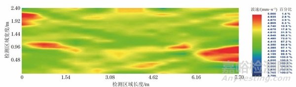 圖2為1#剖面?zhèn)鹘y(tǒng)彈性波CT檢測(cè)的結(jié)果(使用SCE-MATS型混凝土多功能檢測(cè)儀數(shù)據(jù)處理軟件,圖中百分比為該波速區(qū)域的體積占比)。由圖2可見,由于人孔內(nèi)壁存在植入鋼板和傳統(tǒng)方法對(duì)較高波速反應(yīng)不敏感(鋼材中縱波聲速≥5900 m/s),傳統(tǒng)的彈性波CT檢測(cè)模式已無法顯示出人孔的位置。