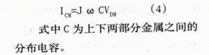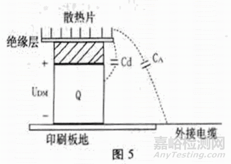 圖5是電壓驅(qū)動(dòng)模式的一個(gè)實(shí)例。圖中Q是大功率的開(kāi)關(guān)管,Q可看成是差模電壓源UDM,共模電流ICM的途徑是由Q通過(guò)開(kāi)關(guān)管和散熱片之間的分布電容Cd到達(dá)散熱片,散熱片是共模天線的一個(gè)極。然后以空間位移電流的形式,即通過(guò)C A到達(dá)外部接線,外部接線是天線的另一個(gè)極,共模電流再由印制板地回到Q。