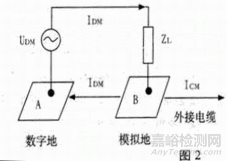 例1:在印制電路板上為了把數(shù)字部分和模擬部分隔離,常把地分割成數(shù)字地和模擬地。如果這兩部分之間有信號(hào)聯(lián)系,如圖2所示,并且數(shù)字地和模擬地的連接部分AB比較細(xì)長(zhǎng),存在一定電感,則差模電流IDM將在AB連接線的電感上產(chǎn)生共模驅(qū)動(dòng)電壓源,從而引起共模輻射,天線一部分是數(shù)字地,另一部分是模擬地和外接地線。
