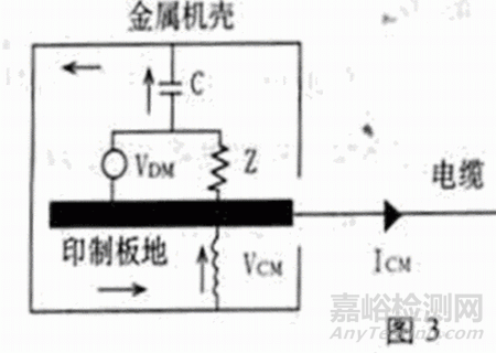 例2:印制電路板的地通過(guò)接地導(dǎo)線與機(jī)殼相連,如圖3所示。印制板上有信號(hào)線與機(jī)殼貼近,于是差模源VDM通過(guò)分布電容C耦合到機(jī)殼上,引起差模電流,該電流通過(guò)機(jī)殼和接地線又回到印制板的差模源。如果接地線存在一定的電感L,則差模電流在L上產(chǎn)生電壓降VCM,成為共模驅(qū)動(dòng)電壓,從而引起共模輻射。這時(shí)天線的一部分是外接地線,另一部分是機(jī)殼。這種輻射常發(fā)生在以下情況,例如設(shè)備內(nèi)部的地址線、數(shù)據(jù)線等扁平電纜貼近機(jī)殼,分布電容較大,印制板和機(jī)殼之間的連接線細(xì)長(zhǎng)或接觸不良等等。