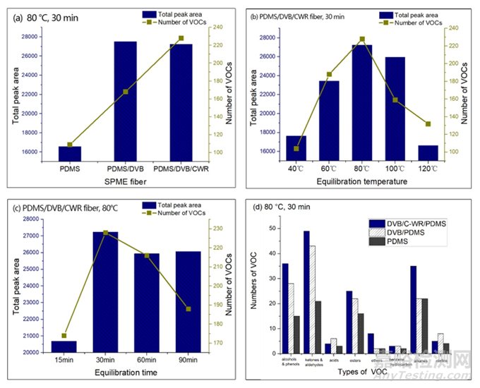 ▲ (a)使用不同纖維萃取頭檢出的VOCs數(shù)量和總峰面積;(b)不同溫度下檢出的VOCs數(shù)量和總峰面積;(c)不同平衡時間下檢出的VOCs數(shù)量和總峰面積;(d)不同纖維萃取頭檢出的VOCs類型。