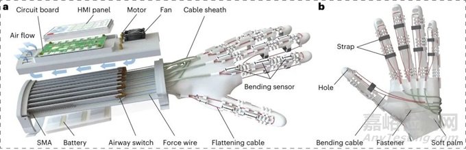 圖1:a)軟手套的分解圖。通過(guò)選擇性地加熱SMA 彈簧致動(dòng)器,彎曲電纜和壓平電纜分別拉動(dòng)手指進(jìn)行彎曲和壓平。電路板和 HMI 面板集成在一起,便于控制和交互。五對(duì)電機(jī)開(kāi)關(guān)用于選擇性地冷卻指定的 SMA。b)軟手套手部的后視圖。彎曲電纜穿過(guò)帶子的小孔并連接到指尖。指尖預(yù)留了一個(gè)孔,用于保證觸摸靈敏度。(圖片來(lái)自原文)