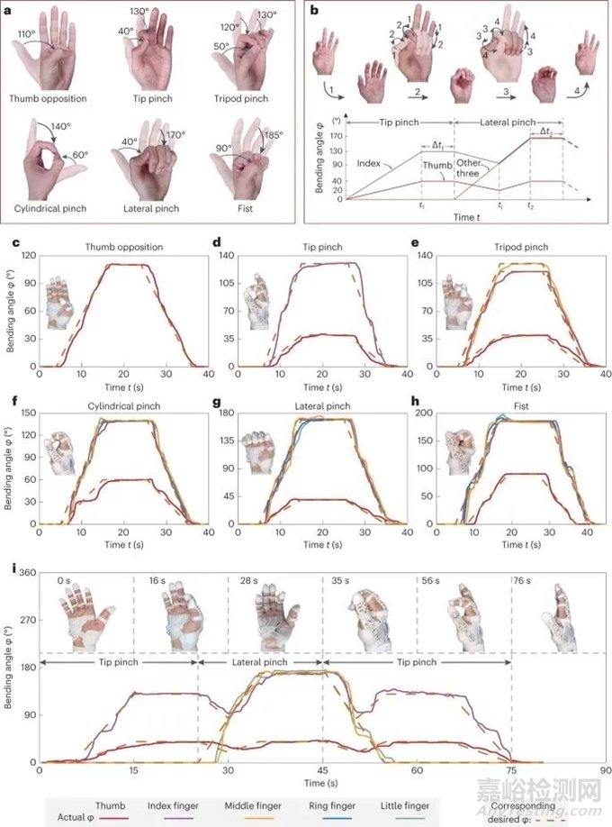圖3:a)六種單模 FMS 的圖示:拇指對(duì)位、尖端捏捏、三腳架捏捏、圓柱形捏捏、橫向捏捏和拳頭。所涉及手指的彎曲角度在手勢(shì)附近提供,箭頭表示運(yùn)動(dòng)方向。b,代表性開(kāi)關(guān)模式FMS:尖端捏緊到橫向到尖端捏緊以及五個(gè)手指的相應(yīng)控制方案。c – h,六種單模式 FMS 康復(fù)中所需彎曲角度與實(shí)際彎曲角度的比較:拇指對(duì)位 ( c )、尖端捏捏 ( d )、三腳架捏捏 ( e )、圓柱捏捏 ( f )、橫向捏捏 ( g ) 和拳頭(h)。i,從尖端捏捏到橫向捏捏到尖端捏捏的代表性開(kāi)關(guān)模式 FMS 康復(fù)。實(shí)線表示相關(guān)手指的實(shí)際彎曲角度,棕色虛線表示相應(yīng)的所需彎曲角度。(圖片來(lái)自原文)