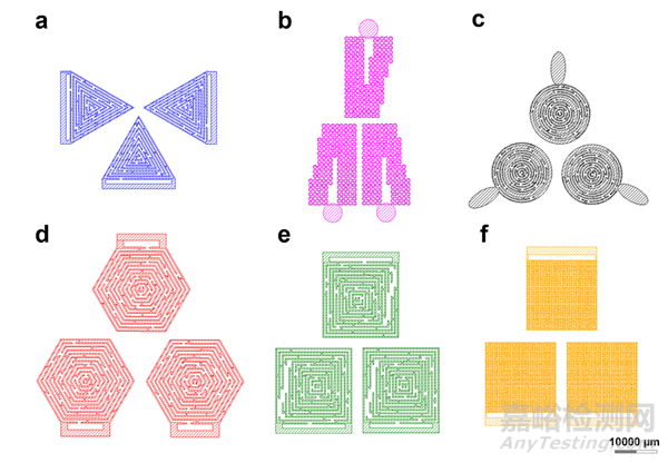 圖3. 心電圖電極設(shè)計(jì)的CAD布局:(a) 三角形迷宮、(b) Peano曲線、(c) 圓形迷宮、(d) 六角形迷宮、(e) 方形迷宮和 (f) Hilbert曲線。圖源來(lái)自論文。
