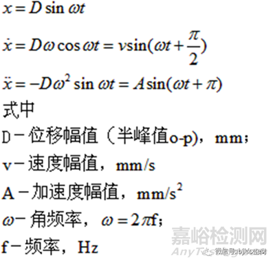 正弦振動(dòng)試驗(yàn)中常用的運(yùn)動(dòng)參數(shù)是位移、速度、加速度。一個(gè)正弦振動(dòng)信號(hào)的位移、速度、加速度可分別由下列公式表示: