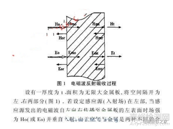 質(zhì),于是在板的左表面產(chǎn)生反射,使一部分電磁波Hor(或Eor)向左傳播,即反射波。另一部分電磁波射入金屬內(nèi)部,其場(chǎng)強(qiáng)為Hmo(或Emo ),向右繼續(xù)傳播,經(jīng)過金屬板厚度t后,由于金屬對(duì)電磁波的吸收,場(chǎng)強(qiáng)減弱至Hmt(或Emt)。