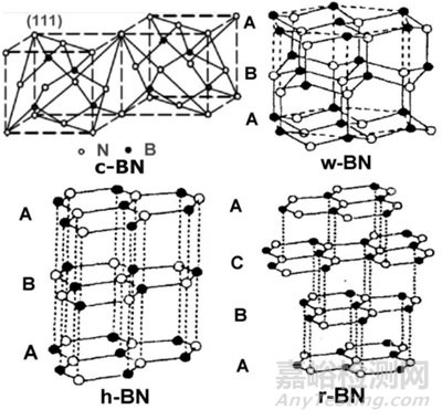 氮化硼(BN)是由氮原子和硼原子通過不同雜化方式所構(gòu)成的晶體。BN晶體主要有四種不同的變體:具有sp3雜化B-N鍵的立方氮化硼(c-BN)和纖鋅礦氮化硼(w-BN),以及具有sp2雜化B-N鍵的六方氮化硼(h-BN)和菱方氮化硼(r-BN)。其中h-BN和c-BN為熱力學穩(wěn)定結(jié)構(gòu),r-BN和w-BN為亞穩(wěn)態(tài)結(jié)構(gòu)。不同結(jié)構(gòu)的氮化硼材料表現(xiàn)出不同的性質(zhì),通常,氮化硼材料的化學穩(wěn)定性高,抗氧化能力強,這些性質(zhì)使得不同結(jié)構(gòu)的材料都有著十分獨特的應用價值。