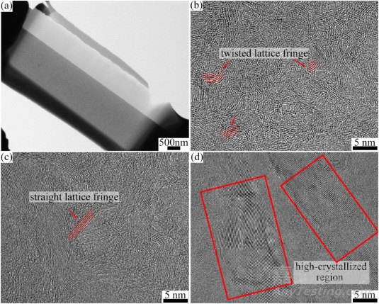 利用聚焦離子束制備TEM樣品,通過TEM來表征樣品的微觀結(jié)構(gòu),以進一步研究兩個界面之間的結(jié)構(gòu)差異。圖2a顯示,不同相之間存在清晰的邊界??梢詼y量沿方向的平面尺寸(La)和沿方向的堆疊厚度(Lc),以評估BN的結(jié)晶度。如圖2b所示,低壓沉積的BN1是準各向同性的,具有扭曲和混沌的晶格條紋。Lc小于10層。沉積壓力增加后,BN2的結(jié)構(gòu)有序度較BN1提高。圖2c顯示了靠近SiC纖維的BN結(jié)構(gòu)。晶格條紋無序堆疊,但保持相對平直。La和Lc明顯增加。圖2d中,外BN界面的結(jié)晶度進一步提高,出現(xiàn)了具有幾十層的高結(jié)晶區(qū)域。