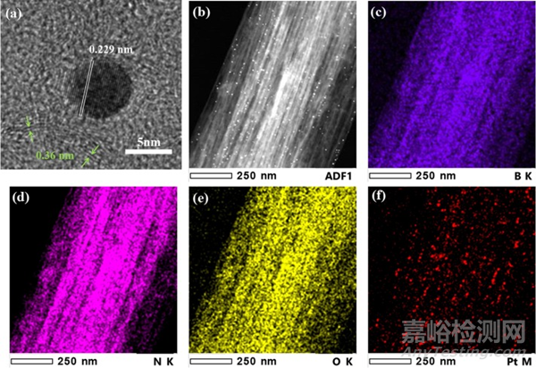 如圖3所示,樣品在BN納米帶氣凝膠的納米孔處顯示出均勻的Pt NPs(平均直徑5-10nm)。Pt2/BN-na樣品的元素分布進一步表明,Pt NPs是均勻且高度分散的(圖3c-f)。Pt NPs的兩個原子平面距離測量為0.229nm(圖3a),與Pt金屬沿[111]方向的晶格間距一致。BN-na(002)平均晶面距離為0.36nm,略大于體相h-BN(0.34nm),顯示出具有豐富位錯結(jié)構(gòu)的渦層BN相。這些具有更多BOx和B-OH種類的位錯結(jié)構(gòu)可能是高度分散的Pt NPs的理想錨定位點。
