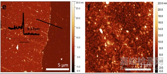 圖4展示了hBN薄膜的AFM圖和線掃描輪廓(e)及hBN薄膜的AFM特寫圖(f)。薄膜的清晰邊緣使得能夠進行非常精確的AFM測量,平均厚度為∼3nm,均方根粗糙度為3.5 nm(圖4 e)。圖4f中AFM特寫圖顯示了轉(zhuǎn)印過程后這些薄膜中出現(xiàn)了典型褶皺,還可以注意到偶爾出現(xiàn)的微小白點。