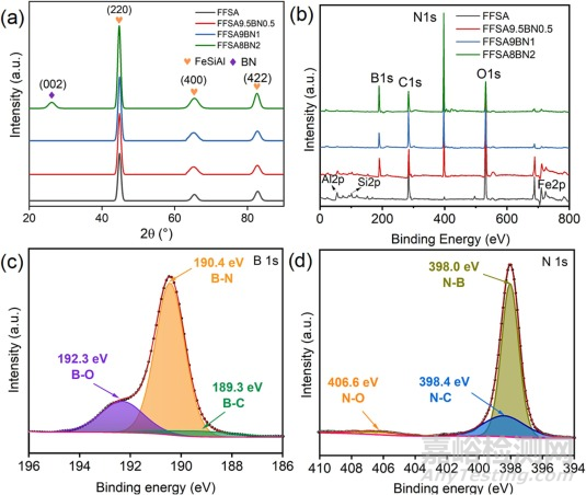如圖7b所示,F(xiàn)FSA的XPS光譜揭示了N1s和O1s光譜的存在,可分別歸因于研磨過程中涉及氧氣和氮氣的等離子體處理。與FFSA相比,F(xiàn)FSA9BN1和FFSA8BN2復合材料表面上的Fe、Si和Al的特征峰幾乎消失,表明復合材料的表面被h-BN致密覆蓋。FFSA9BN1的B1s光譜顯示出三個不同的峰,分別位于189.3、190.4和192.3 eV(圖7c)。其中,189.3和190.4eV處的峰分別歸屬于B-C和B-N鍵,192.3eV處的峰表明在h-BN中存在BOxNy以及B2O3。圖7d顯示,N1s光譜顯示出三種化學態(tài),分別位于406.6、398.4和398.0eV,可歸屬于N-O、N-C和N-B鍵。