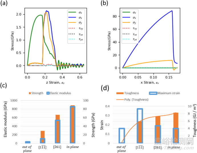 沿hBN平面外和平面內(nèi)方向變形的相應應力-應變曲線分別繪制在圖8a和b中。與其他方向相反,拉伸平面外應力-應變曲線在整個變形過程中平滑,沒有尖峰或突然破壞的跡象??v向應力和橫向應力圖也顯示出顯著的非線性響應。盡管[001]方向的拉伸斷裂應變與[261]以及平面內(nèi)方向相當,但由于平面外方向的強度顯著較低,其韌性(從平面外到平面內(nèi)方向單調(diào)增加)顯著低于其他方向(圖8c,d)。然而,[111-]取向的斷裂應變最高(圖8d)。強度和約束模量都從平面外方向單調(diào)增加到平面內(nèi)方向,但與強度變化相比,平面外方向的定向模量的變化相對較小(圖8c)。