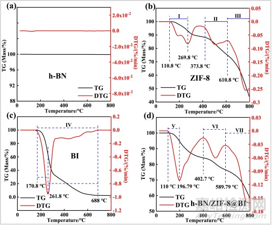 如圖9a所示,h-BN的質(zhì)量沒有明顯變化,僅在98°C時出現(xiàn)少量損失,損失率為0.7%。這意味著h-BN具有優(yōu)異的耐熱性,并且少量質(zhì)量損失可能由h-BN中少量水導致。從圖9d中可以觀察到,h-BN/ZIF-8@BI活性填料在110°C時開始分解,分解速率在196°C時達到最大值(V)。分解溫度與BI相當,但與純BI相比,h-BN/ZIF-8@BI分解速率峰值對應于更低的溫度。此外,在110°C-196°C內(nèi),活性填料的降解率遠高于BN/ZIF-8,這是由于活性填料中BI的快速分解。隨著溫度升高,h-BN/ZIF-8@BI的分解速率先升高后降低,溫度范圍與II(ZIF-8)在VI峰的溫度范圍基本一致。因此,h-BN、ZIF-8和BI合成的復合填料的分解趨勢與單體的分解趨勢基本一致,h-BN/ZIF-8@BI的合成被進一步證明。