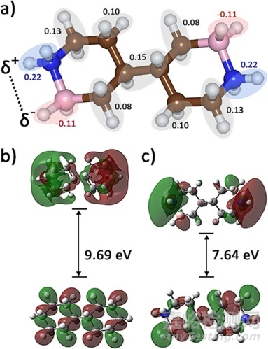 圖10. BN雙環(huán)己基的平均穆利肯電荷分析(a), 雙環(huán)己基(b)和BN雙環(huán)己基(c)的HOMO和LUMO之間的能隙圖