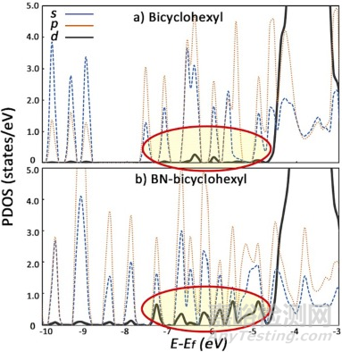 圖12. 雙環(huán)己基和BN-雙環(huán)己基的分波態(tài)密度(PDOS)