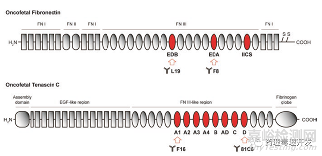 除了膜抗原靶點(diǎn),細(xì)胞外基質(zhì)也是一類潛在可發(fā)成ADC產(chǎn)品的靶點(diǎn)。腫瘤細(xì)胞生長迅速,血管不規(guī)則,導(dǎo)致氧氣供應(yīng)和利用的不充分,形成缺氧微環(huán)境。腫瘤細(xì)胞在厭氧條件下會產(chǎn)生諸如CO2,H+-lactate等呼吸終產(chǎn)物,后者是導(dǎo)致腫瘤間質(zhì)出現(xiàn)酸性環(huán)境的重要原因之一(pH從6.5-7變?yōu)?左右)。異常的pH值環(huán)境會誘導(dǎo)細(xì)胞外基質(zhì)組分產(chǎn)生剪接異變體,如纖連蛋白和tenascin C。纖連蛋白是糖蛋白,是細(xì)胞與基質(zhì)組分之間的橋梁,涉及細(xì)胞粘附、遷移、歸巢、傷口愈合等功能。纖連蛋白中的EDB和EDA片段選擇性在腫瘤中表達(dá),正常組織中的纖連蛋白不含這一片段。Tenascin C是另外一個參與細(xì)胞結(jié)合的寡聚體糖蛋白,與纖連蛋白類似,也存在腫瘤特異表達(dá)的不同剪接體形式。纖連蛋白和tenascin C的結(jié)構(gòu)如下,箭頭所示為開發(fā)成抗體的區(qū)域。