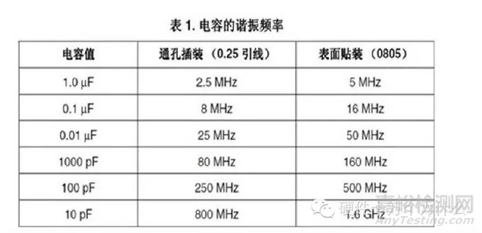 不同封裝的電容有不同的諧振頻率,下表列出了不同容值不同封裝的電容的諧振頻率: